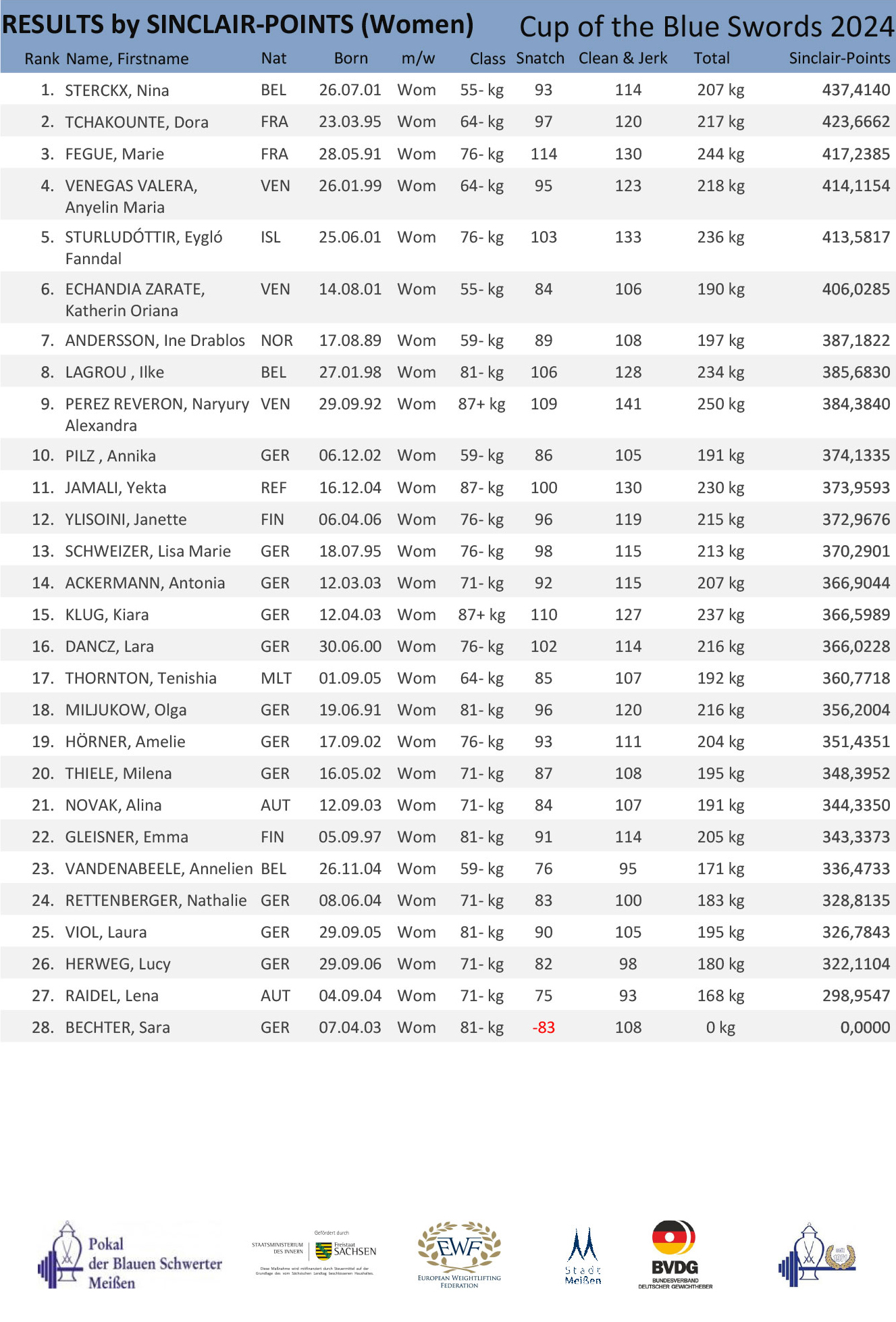Bei der Hitzeschlacht im Meißner Heiligen Grund beim 33. Gewichtheber-Turnier um den Pokal der Blauen Schwerter im Jahr der XXXIII. Olympiade in Paris kämpften 23 männliche und 28 weibliche Teilnehmer um den begehrten Pott aus weißem Gold. Neulinge aus Malta, Island, Armenien und Bosnien waren unter den Sportlern aus 14 Nationen. Der große Ansturm auf die begehrten Startplätze forderte vom Veranstalter eine enge Taktung und straffe Organisation der Wettkämpfe.