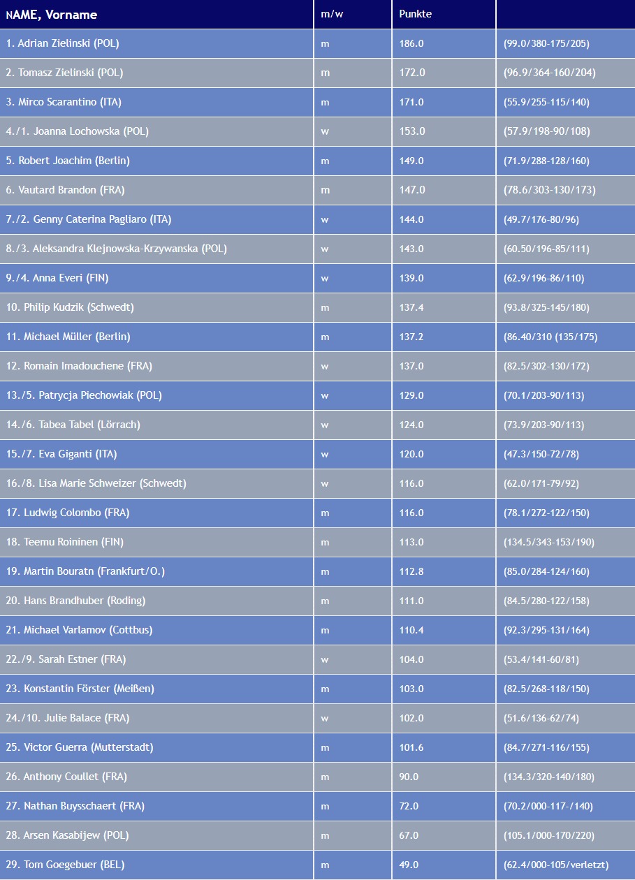 Übrigens hätte schon in der ersten Veranstaltung ein weiterer Pole das Zeug dazu gehabt, in den Pokalkampf entscheidend eingreifen zu können. Aber Arsen Kasabijew hatte nur einen einzigen gültigen Versuch im Reißen. Die Lasten von 170 kg und 220 kg, die er anging, hätten 184.0 Punkte ergeben können.